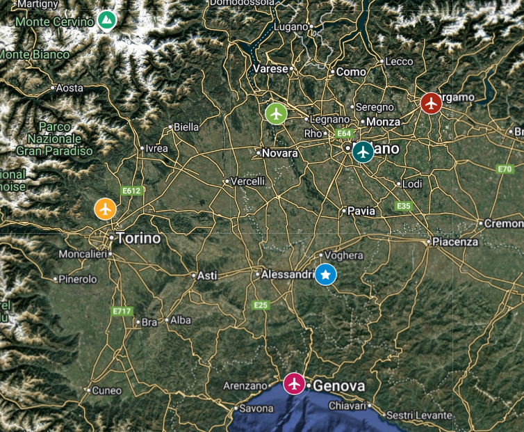 - Genoa (GOA) – approximately 1 hour 15 minutes by car, 105 km